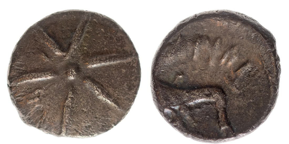 Celtic Britain. Atrebates and Regni. Tincommius, ca. 30 BC-10 AD. AR Unit, struck ca. 20-10 BC. 1.14 gm, 12mm. Comet type (Atrebatic D). Southern mint. Six arms radiating from a central pellet, rev. Boy right on a dolphin, TIN below. Van Arsdell 371-1; ABC 1127; S.88. Toned. Very Fine.