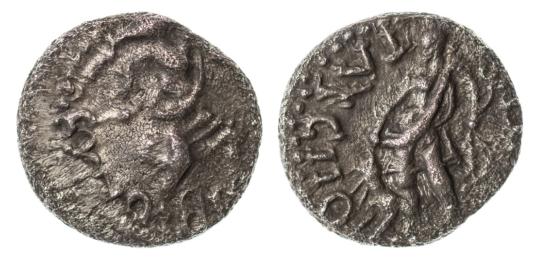 Celtic Britain. Trinovantes and Catuvellauni. Cunobelin (ca. 10-43 AD). AR Unit, struck ca. 20-43 AD. 1.24 gm, 12mm. Hunter standing facing, head left, holding bow, dog at left; TASCIIO(VANI), rev. Hunter advancing right, holding sword and animal, CVNOBELIN(VS). Van Arsdell 2063-1, De Jersey, Silver, Group D6; S.317. Light gray over mild porosity. Very Fine.
