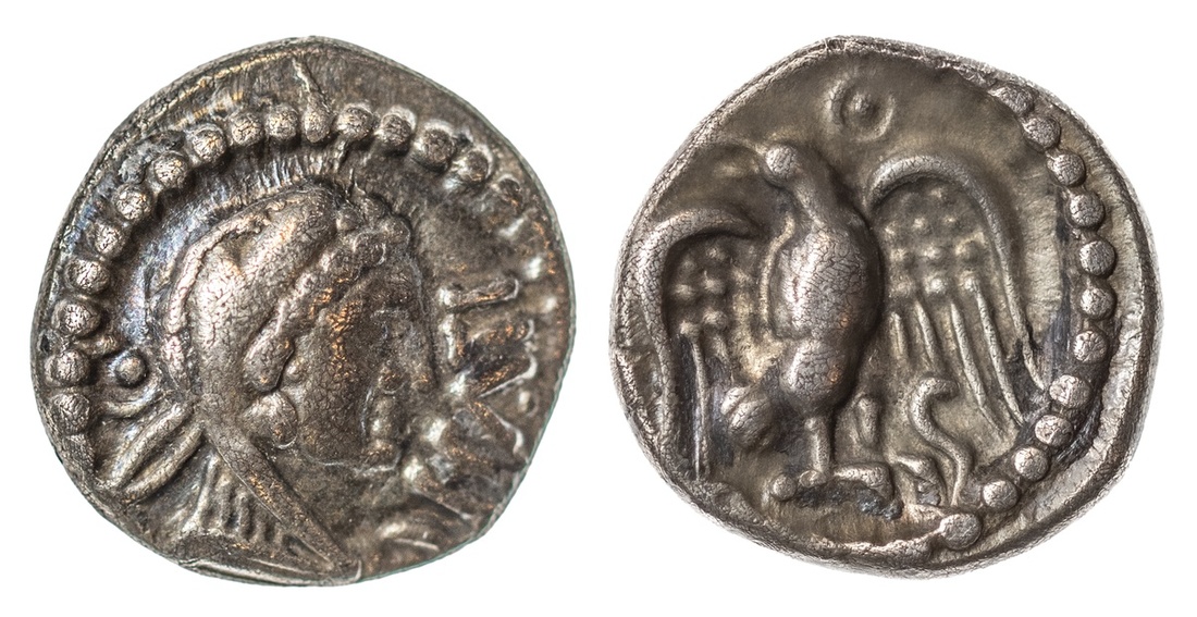 Celtic Britain. Trinovantes and Catuvellauni. Epaticcus (ca. 35-43 AD). AR Unit. 1.21 gm, 12mm. Epaticcus Eagle (Atrebatic L) type. Hercules head right, pellet in crescent behind, EPATI, rev. Eagle standing facing on snake, head left, wings displayed, pellet in annulet above. Van Arsdell 580-1; ABC 1346; S.356. Pearly gray. Very Fine.