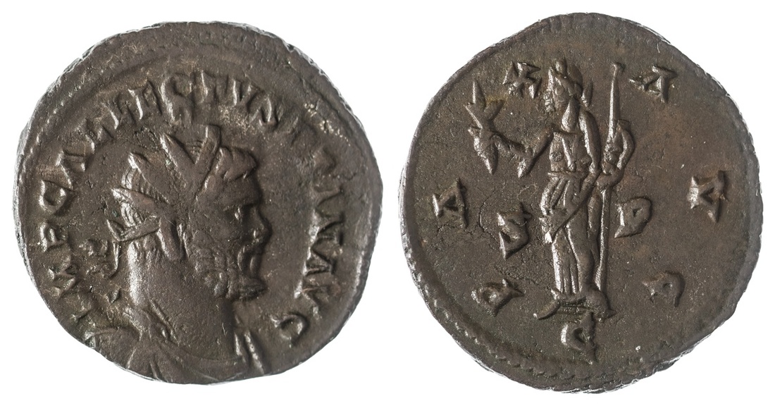 Roman Britain. Allectus, Roman-British emperor (AD 293-296). AE Antoninianus. "C" mint. 3.96 gm, 22mm. Radiate, draped and cuirassed bust right, IMP C ALLECTVS PF IN AVC, rev. Pax standing left, holding olive branch and scepter, S-P, C below. S.684Avar. Very Fine. Ex Aurora Family Collection, Goldberg Sale 96, lot 2141.
