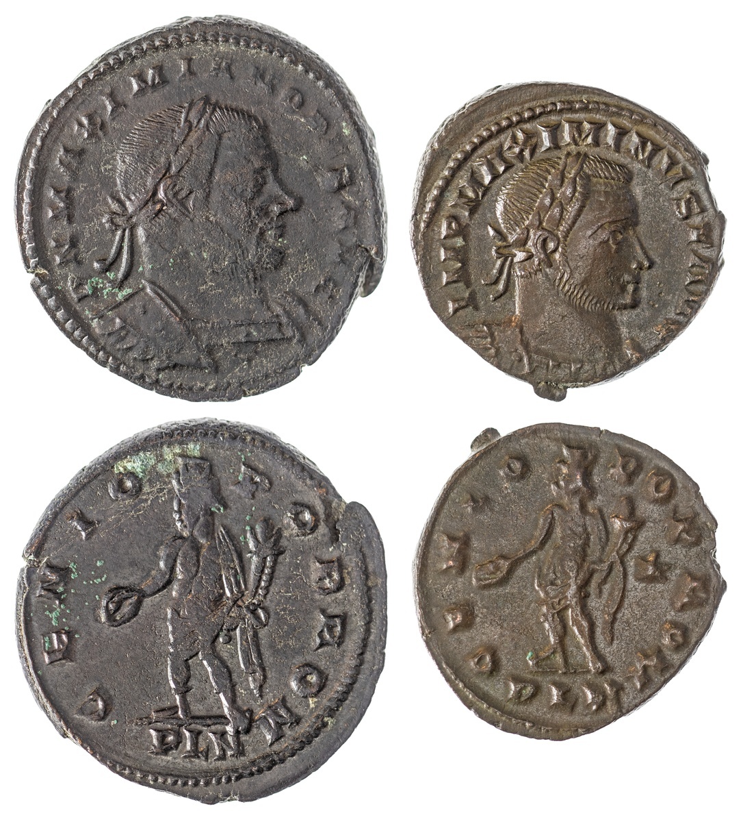Roman Britain. Pair of London mint Folles. Maximianus, second reign (AD 307-308). RIC 85. Dark silvery brown. Very Fine; and Maximinus II (AD 310-313). RIC 209b. Rich olive brown. Near Extremely Fine. Reverses: Genius left, PLN in ex. (2)