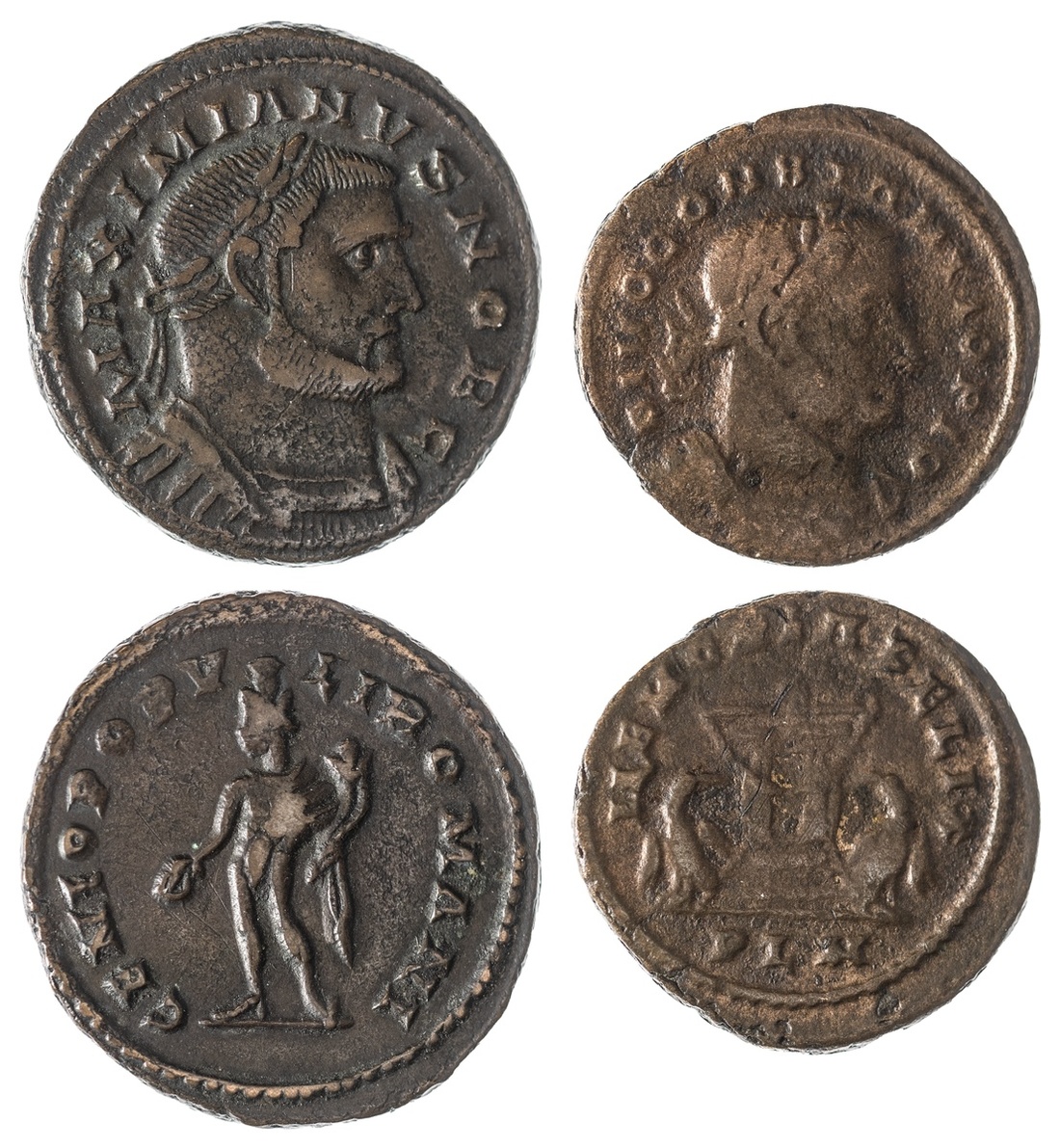 Roman Britain. Pair of London mint AE Folles: Galerius, as Caesar (AD 293-305). AE Follis. Struck ca. AD 296-303. Reverse: Genius left. RIC 15. Very Fine; and Divus Constantius I (died AD 306). Reverse: Lighted and garlanded altar, eagle either side; MEMORIA FELIX, PLN in ex. RIC 110. Brown over light roughness. Fine. (2)