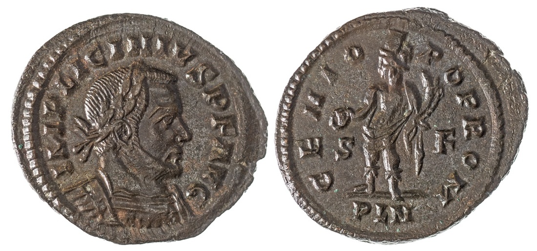 Roman Britain. Licinius I (AD 308-324). AE Follis. Londinium (London), struck AD 313-314. 3.54 gm, 23mm. RIC 3. Laureate and cuirassed bust right, rev. Genius standing left, holding patera and cornucopia, S-F, PLN below. RIC 3. Deep sea-green patina, near black. Choice Extremely Fine.