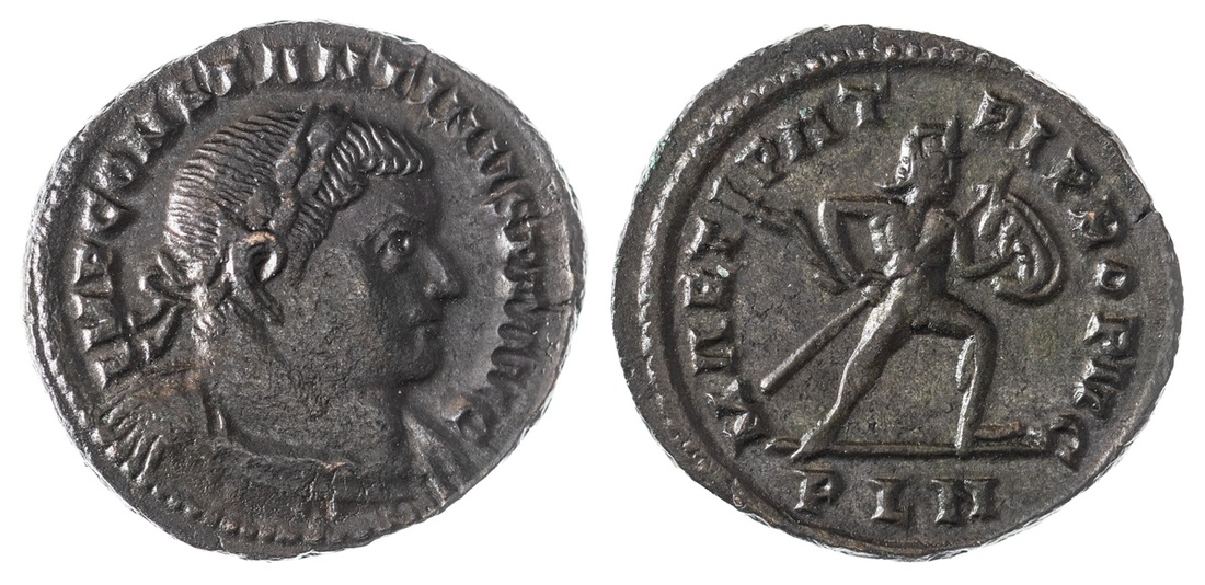 Roman Britain. Constantine I (AD 307-337). AE Follis. Londinium (London), struck AD 307-310. 5.89 gm, 25mm. Laureate and cuirassed bust right, rev. Mars advancing right, holding transverse spear and shield RIC 108. Deep olive sea-green. Good Very Fine.