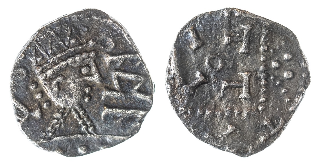 England. Early Anglo-Saxon. Primary Phase (ca. 680-710). AR Sceat. 1.12 gm. Series C. Crowned bust on pyramidal neck right, AEPA in runes before, rev. Standard with TOTII in square, pseudo-legend around. S.779. Toned. Good Very Fine.