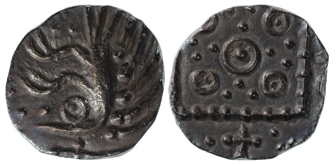 England. Early Anglo-Saxon. Continental Issues (ca. 695-740). AR Sceat. 1.15 gm. Later issues. Plumed bird right, pellet in annulet below, rev. Standard with pellet in annulet at center and each corner, pellet triplex in angles, all within a beaded square. N.49, S.791, Abramson 87/40. Attractive deep slate gray with pearlescent highlights. Extremely Fine. Ex CNG mailbid Sale 39, Sept. 18, 1996, lot 2275.