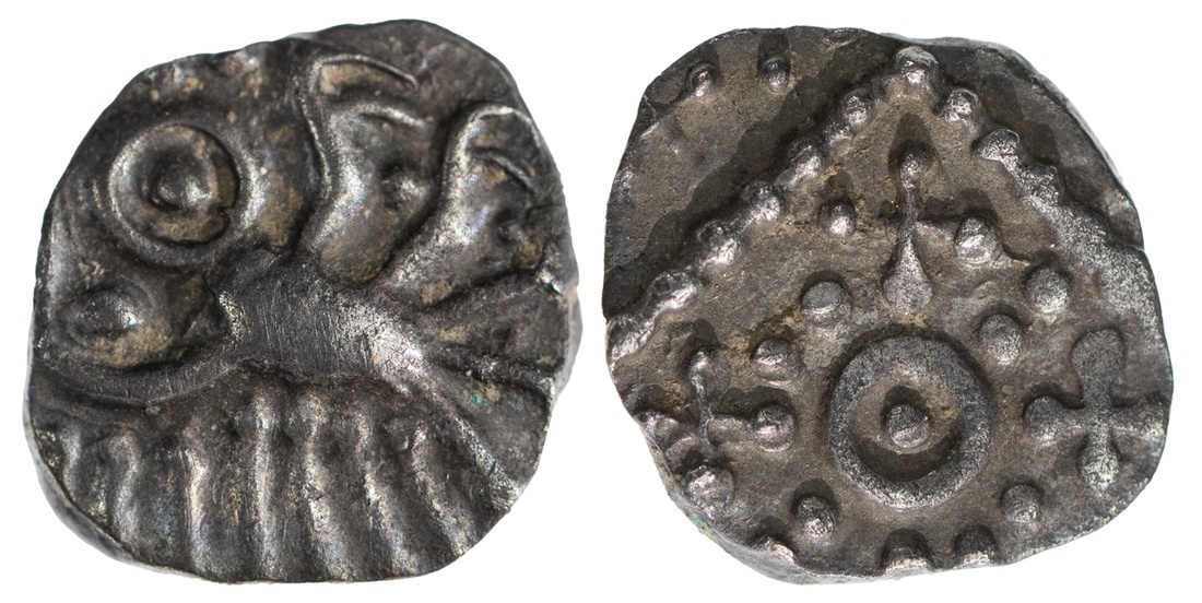 England. Early Anglo-Saxon. Continental Issues (ca. 695-740). AR Sceat. 1.01 gm. Later issues. Plumed bird right, pellet in annulet below, rev. Standard with pellet in annulet at center, pellet cross in each corner, and linear pair of pellets in angles, all within a beaded square. N.49, S.791, Abramson 87/40. Purchase Patrick Finn List 15, (1999) no. 45. Toned. Good Very Fine.