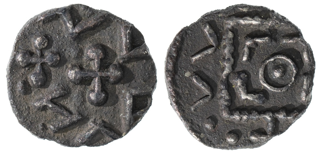 England. Early Anglo-Saxon. Continental Issues (ca. 695-740). AR Sceat. 1.08 gm. Series D, Type 8. Crude standard with angular symbols, rev. Central cross pommée, cross and pseudo-legend around. S.793. Toned. Good Very Fine.
