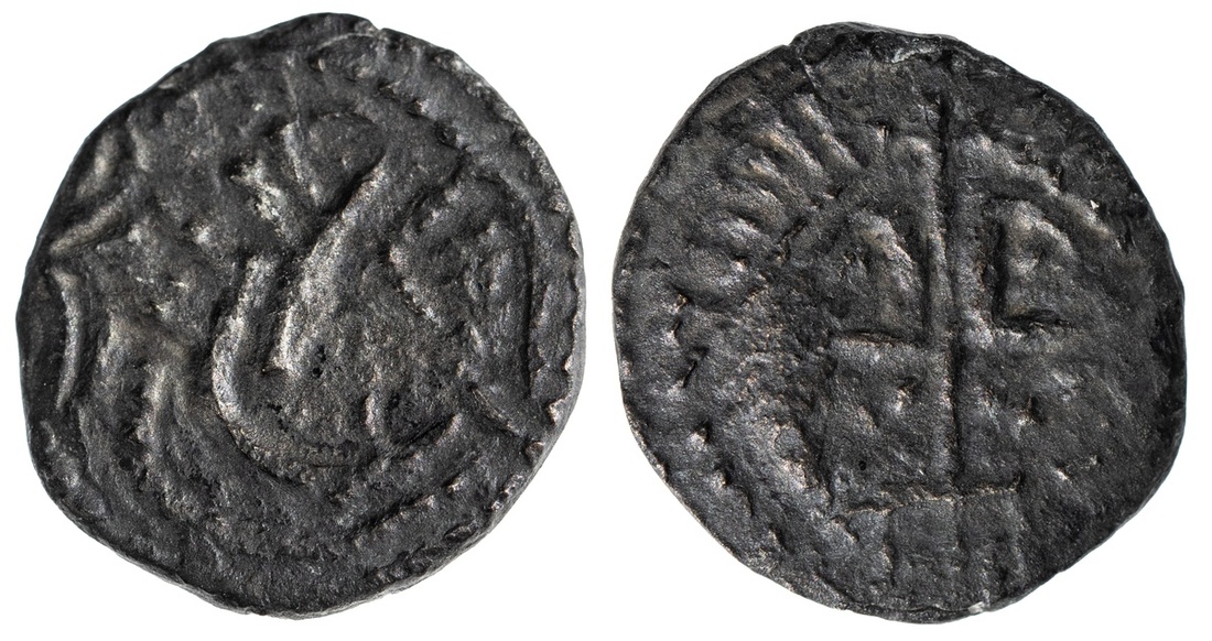 England. Early Anglo-Saxon. Secondary Phase (ca. 710-760). AR Sceat. 0.94 gm. Series J, Type 72. Two diademed heads face-to-face, cross between, rev.Bird right, looking back at serpent. S.802C, Abramson 19.10. Rare. Toned over minor roughness. Very Fine. Found: Driffield, Yorkshire, 2017.