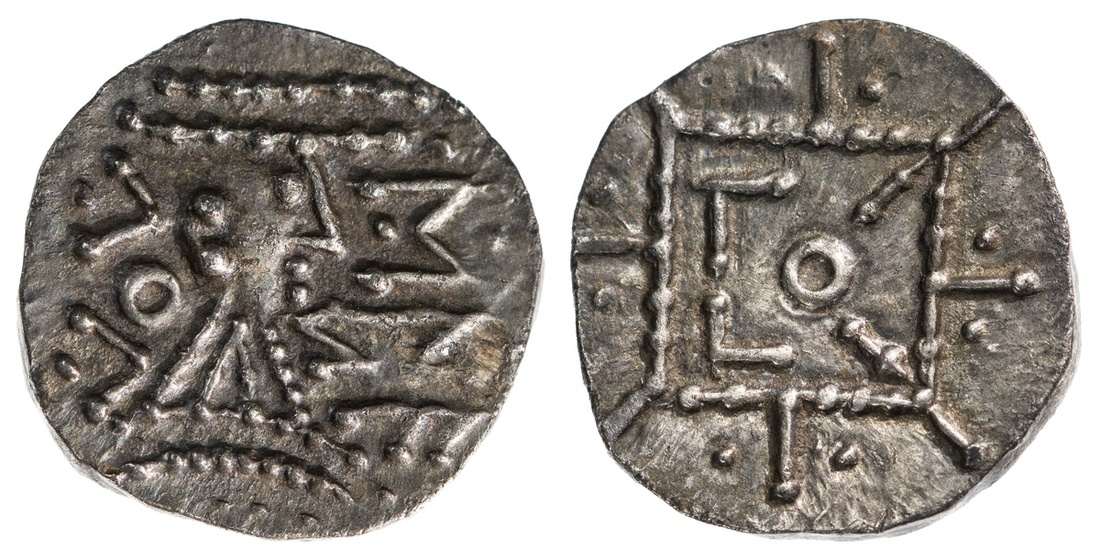 England. Early Anglo-Saxon. Secondary Phase (ca. 710-760). AR Sceat. 0.98 gm. Series R. Bust on pyramidal neck right, two pelleted lines replace radiate crown, EPA in runes, rev. Standard with LOLII in square, 8 rays emanating out from square. S.813. Pearly gray. Extremely Fine.