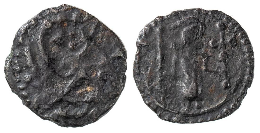 England. Early Anglo-Saxon. Secondary Phase (ca. 710-760). AR Sceat. 0.95 gm. Series U, Type 23b. Standing figure facing with two crosses, rev. Pecking bird in vine. N.83, S.816, Abramson U025. Rare. Toned. Fine. Ex Lord Stewartby Collection, acquired March 1978.