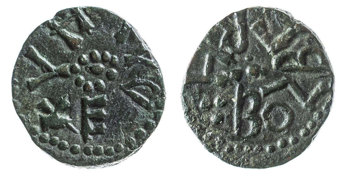 England. Kings of Northumbria. Osberht (849/50-867). AE Styca. Moneyer: Eanwulf. 1.16 gm. OzBERH (pellet triplex) around large central pellet with two flanking smaller pellets, rev. +EANvHF (F with no middle bar) around beaded circle with central pellet. N.191, S.869. Good Very Fine.