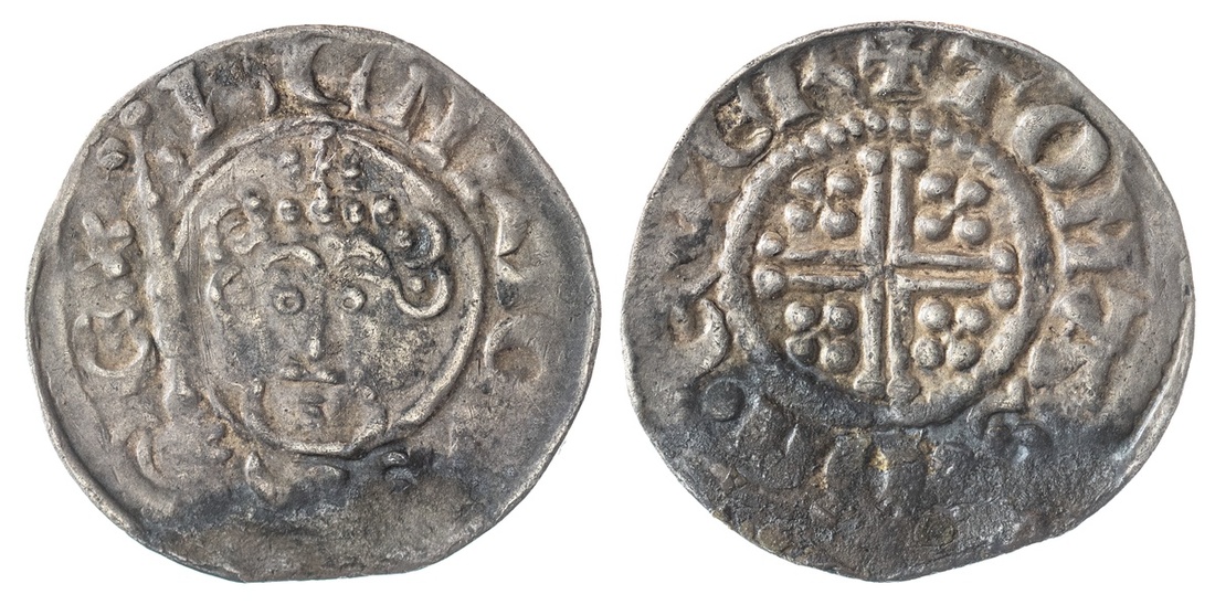 England. Plantagenets. John (1199-1216). Penny. York, moneyer: Tomas. 1.40 gm. Class 5b. Crowned bust facing, five pearls in crown, scepter at left, rev. Voided short cross, pelleted quatrefoils in angles; TOMAS ON EVER. S.1351. Some dark areas in peripheries. Very Fine.