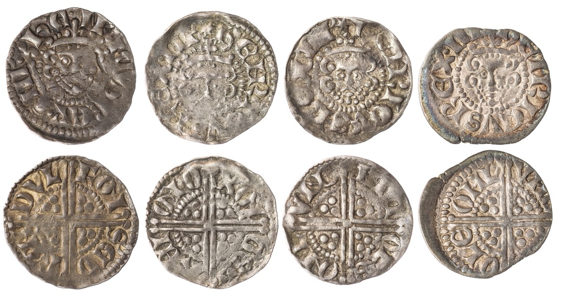 England. Plantagenets. Henry III (1216-1272). Long Cross Coinage, 1247-72. Quartet of Pennies: London, moneyer: Nicole (2). 1.50 and 1.34 gm; S.1363; Oxford, moneyer: Frei. 1.26 gm; and Bury St. Edmunds, moneyer: Randulf. 1.44 gm. Class 5c. About VF-Very Fine. The latter Clonterbrook Trust, Glendining, June 7, 1974, (part) lot 57; Ex Richard Cyril Lockett Collection, English, part IV, Glendining, April 27, 1960, (part) lot 3965. (4)