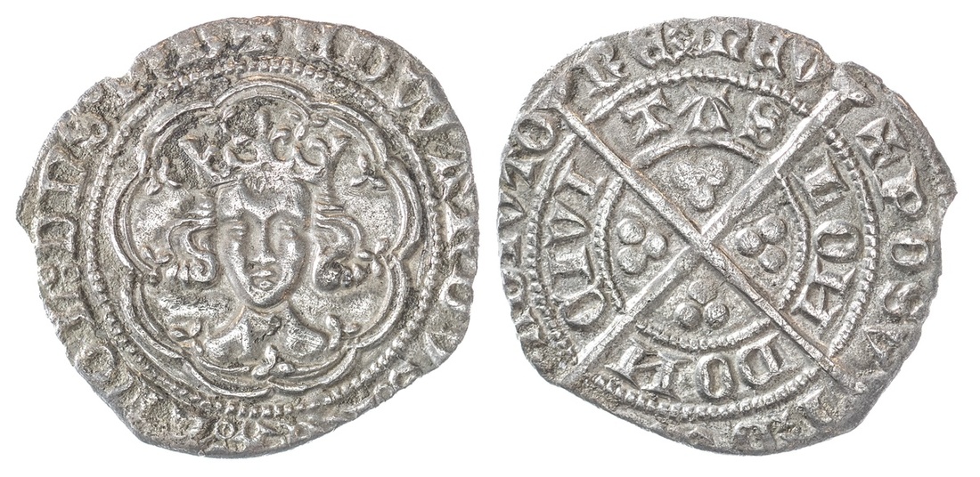 England. Plantagenets. Edward III (1327-1377). Fourth Coinage, Treaty period, 1361-9. Halfgroat. London. 1.89 gm. Crowned facing bust within double tressure of nine arcs, trefoil on each cusp, rev. Long cross pattée, pellet triplex in angles. S.1620. Nice strike, lightly toned. Good Very Fine.