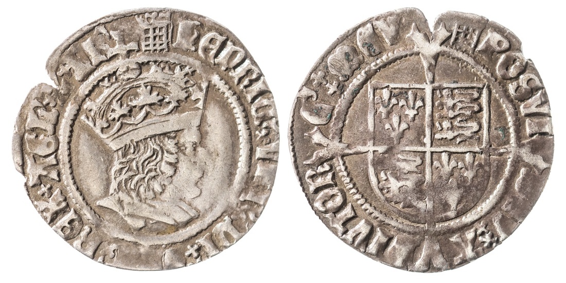 England. House of Tudor. Henry VIII (1509-1547). First Coinage, 1509-26. Groat, mm portcullis. 2.28 gm. Crowned Henry VII portrait right, rev. Shield over cross fourchée. S.2316. Small edge split, weak area obverse. Toned. Very Fine.