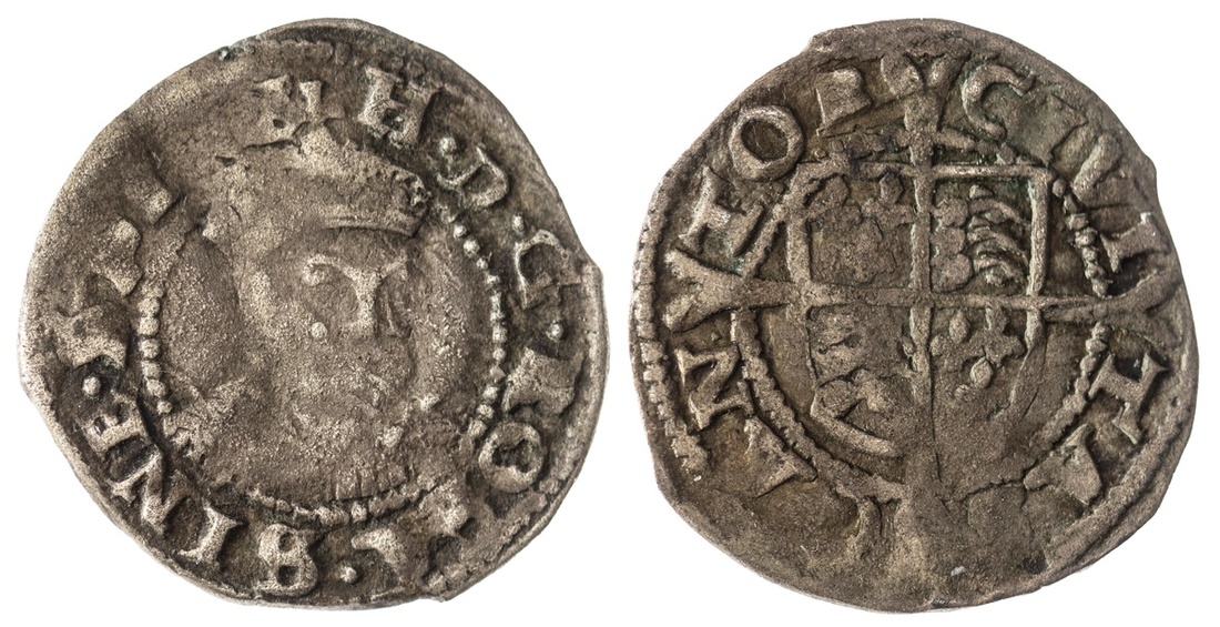 England. House of Tudor. Henry VIII (1509-1547). Third Coinage, 1544-7. Penny. Canterbury. 0.65 gm. Crowned bust facing ¾ right, rev. Shield over cross fourchée. S.2383. Weak centers. Light gray. About Very Fine.