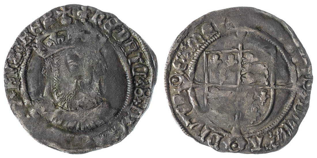 England. House of Tudor. Edward VI (1547-1553). Coinage in the name of Henry VIII. Groat, mm lis. Tower mint. 2.18 gm. Crowned Henry VIII bust ¾ right, rev. Shield over cross fourchée. S.2403. Typical weakness, but decent portrait. Very Fine.