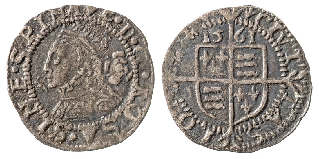 England. House of Tudor. Elizabeth I (1558-1603). Third and Fourth Issues, 1561-77. Threefarthings, 1561 mm pheon. 0.36 gm. Crowned bust left, rose behind, rev. Shield, date above, over cross fourchée. S.2571. rev. Shield, date above, over cross fourchée. Toned. Near Extremely Fine.