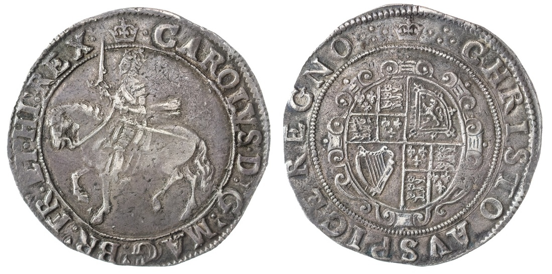 England. House of Stuart. Charles I (1625-1649). Halfcrown, mm crown. Tower mint. 15.06 gm. Group III, third horseman, no caparisons on horse, scarf flying from king's waist, rev. Oval garnished shield with Arms. S.2773. A full weight example with full legends. Toned. About Very Fine.