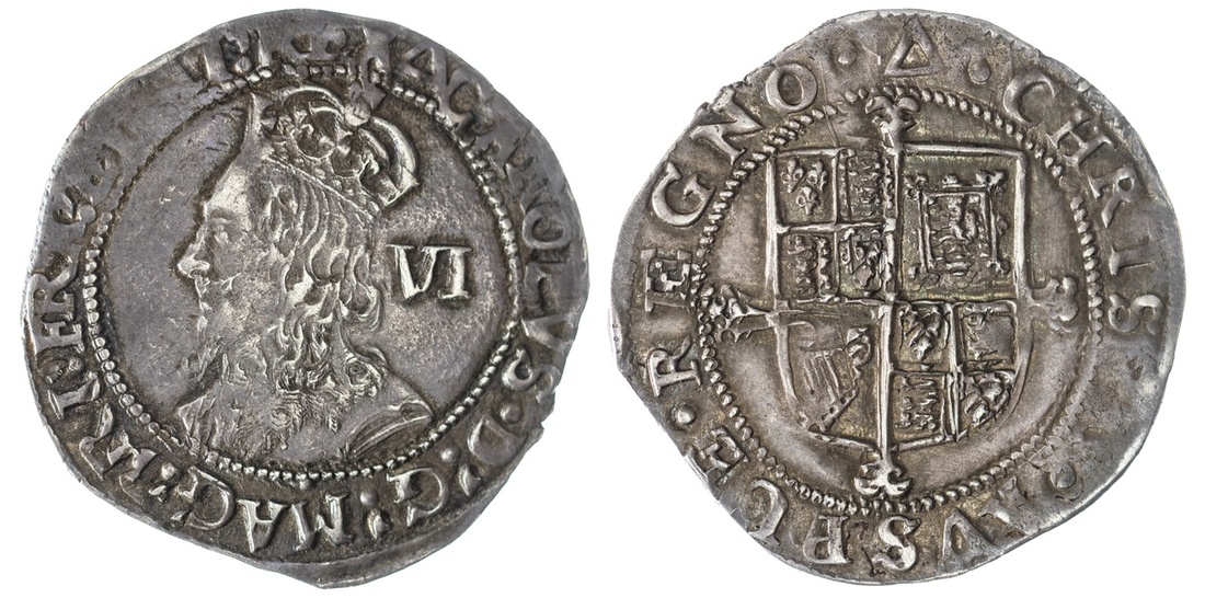 England. House of Stuart. Charles I (1625-1649). Sixpence, mm triangle (1639-40). Tower mint. 3.08 gm. Sixth "Briot's" bust left, VI behind, rev. Shield with Arms over cross moline. S.2817. Pearly-gray tone. Good Very Fine.