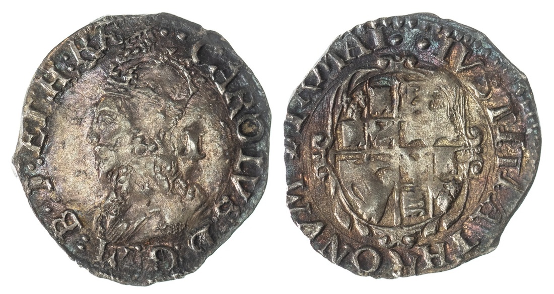 England. House of Stuart. Charles I (1625-1649). Penny, mm two pellets. Tower mint. 0.47 gm. Crowned bust left, I behind, no inner circle, rev. Oval garnished Arms. S.2838. Iridescent tone. Good Very Fine.