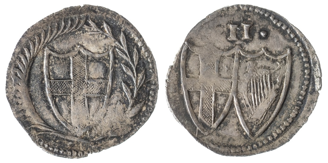 England. Commonwealth. Halfgroat. 0.91 gm. Shield of England within palm and laurel wreath, rev. Conjoined shields of England and Ireland, .II. above, within beaded circle. S.3221. Toned. About Extremely Fine.