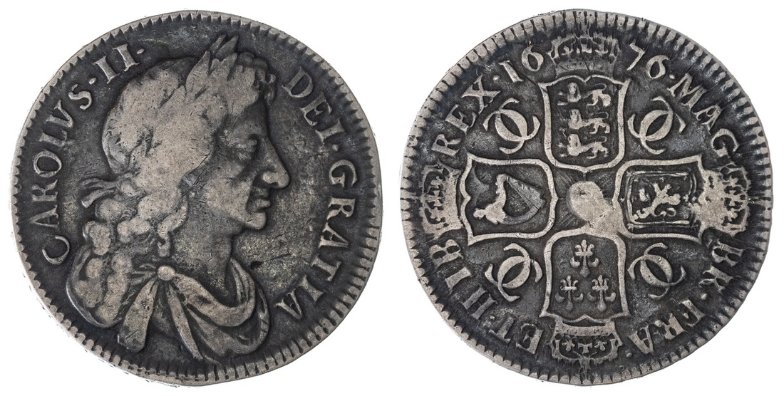 England. Charles II (1660-1685). Halfcrown, 1676. Octavo. Retrograde "1" in date. Laureate, draped fourth bust right, rev. Crowned cruciform Arms, interlinked Cs in angles. S.3367, KM 438.1. Deep gray tone over some minor old contact marks. Good Fine.