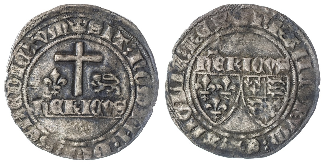 Anglo-Gallic. Henry VI (1422-1450). Grand Blanc aux Ecus (1422-1436), mm crown. Paris. Arms of France and England side by side, rev. Latin cross, lis at left, leopard passant at right. Elias 279. Toned. About Very Fine. Ex Coin Galleries, December 2007, lot 3031.