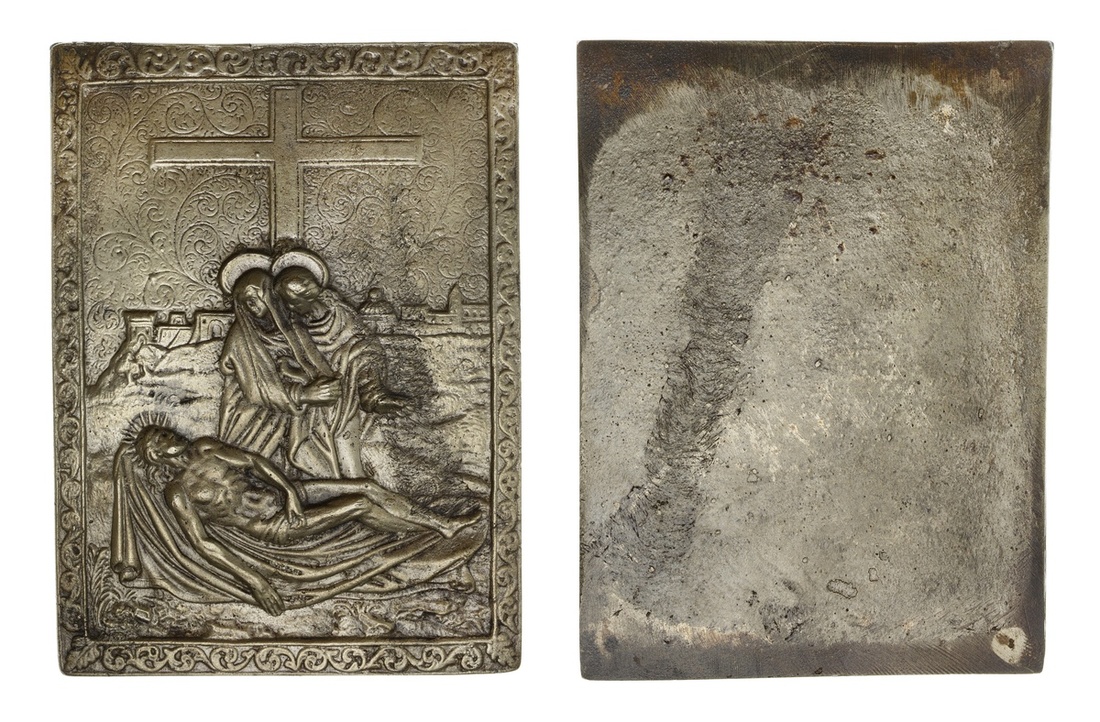 Italy. The Virgin and St. John with the Body of Christ. Rectangular plaquette, ca. 1700. White Metal, 111.8 x 150mm, thickly cast. The radiant Christ lies prone before the nimbate figures of the Virgin and St. Joseph, a wide-armed cross behind in a scroll-pattern field; ornate borders.