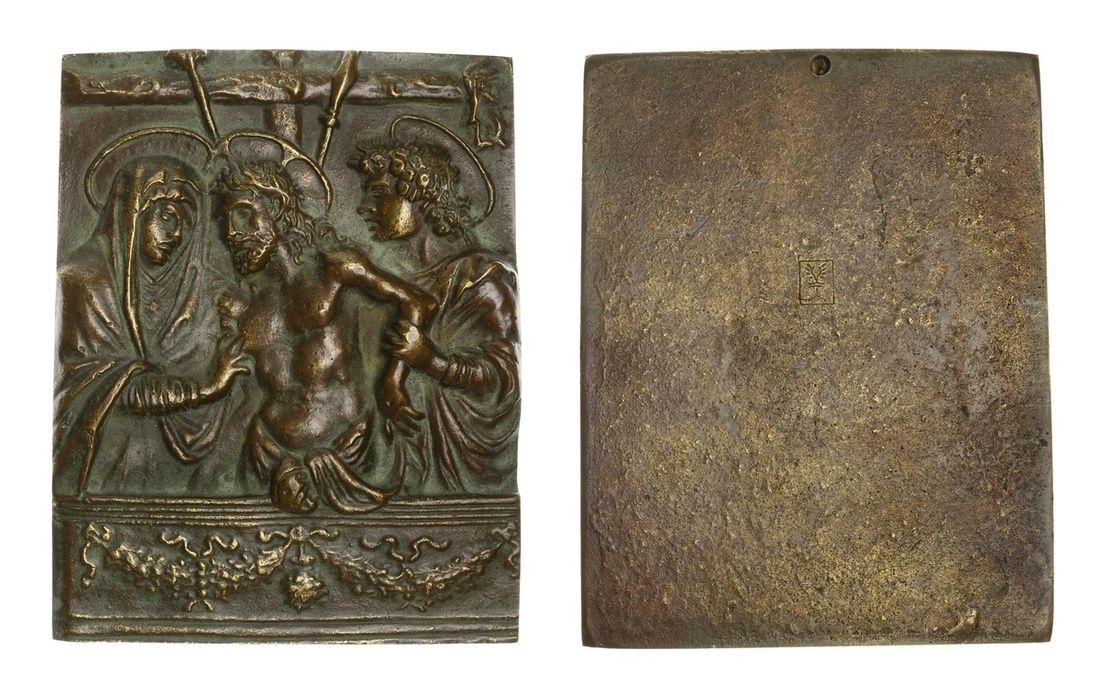 Italy. Venetian artist after Giovanni Bellini, 16th Century. Pietà. Bas-relief plaquette. Bronze, 91 x 111mm. 20th Century cast. Holed at top edge for suspension. Extremely Fine.