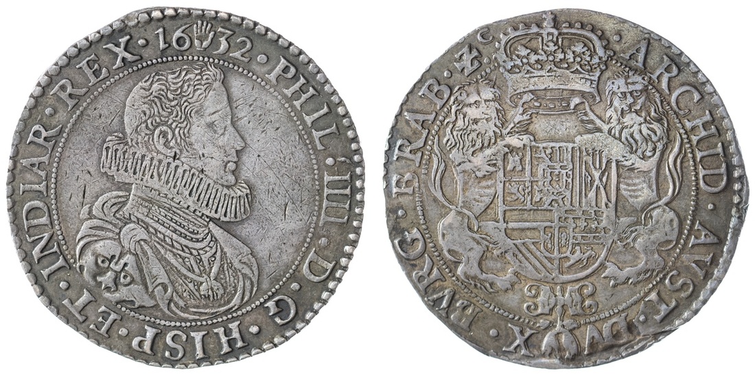 Spanish Netherlands. Brabant. Philip IV (1621-1665). Ducaton, 1638 mm hand. Antwerp. Bare-headed, draped and armored bust right, wearing ruff, rev. Crowned Arms with Golden Fleece supported by lions GH 327-1b-II, KM 72.1. Toned over some old obverse scratches. Otherwise Good Very Fine.