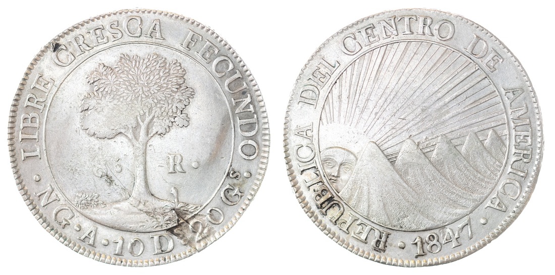 Central American Republic. 8 Reales, 1847 NG A. Guatemala. Sunface rising over five mountain peaks, rev. Ceiba tree. KM 4. Flan flaws reverse. Once lightly cleaned, now toning. About Extremely Fine.