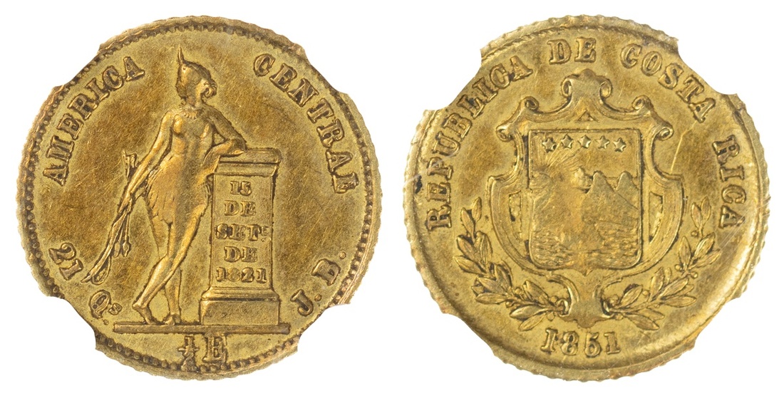 Costa Rica. Republica. ½ Escudo, 1851 JB. Ams, rev. Native woman standing left, leaning against inscribed column. KM 97. Mintage: 6,565 pieces. NGC AU 53.