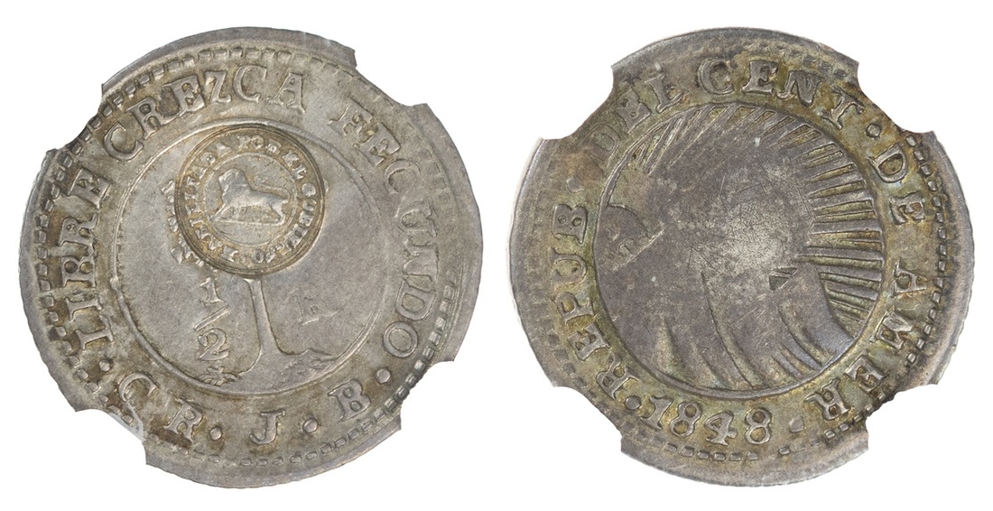 Costa Rica. Republica. Counterstamped Coinage. ½ Real (1849-1857). Type VI (lion) c/s on the reverse of an 1848 CR JB Central American Republic ½ Real. KM 68. NGC VF 30 - C/S AU Strong.