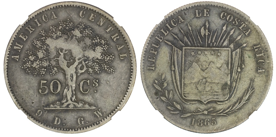 Costa Rica. Republica. 50 Centavos, 1865 GW. Bannered Arms, rev. Tree, 50-Cs. KM 112. 29,000 pieces minted. Rare. NGC XF Details, damaged. Small "x" graffito reverse, some small digs lower reverse.