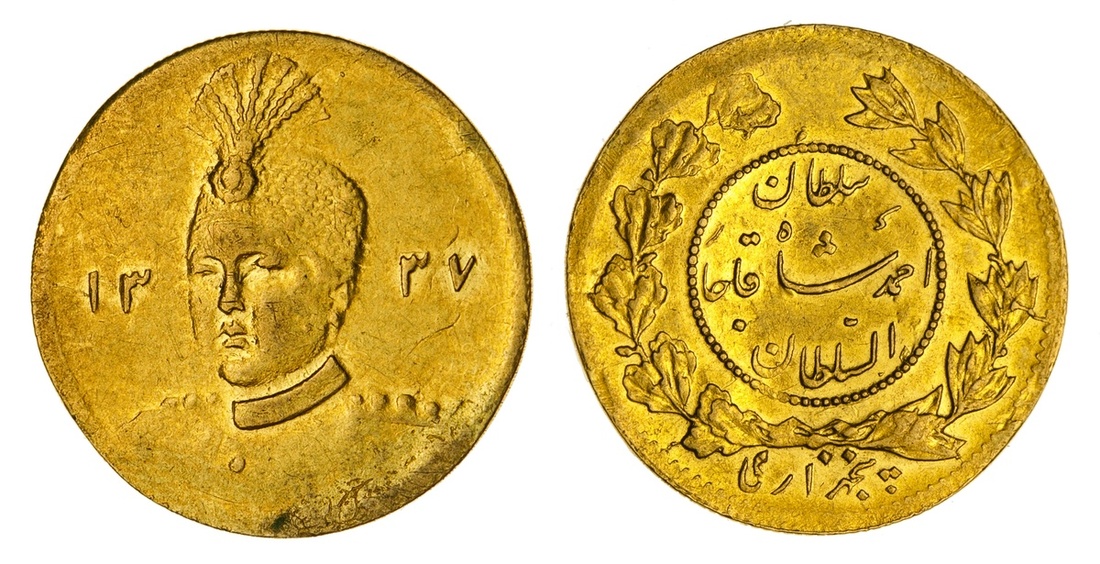 Iran. Sultan Ahmad Shah (AH 1327-1344/ 1909-1925 AD). 5000 Dinar (1/2 Toman), AH 1337. 1.31 gm. Uniformed bust ¾ left, wearing cap with aigrette, dividing date. KM 1071. A few obverse hairlines. About Extremely Fine.