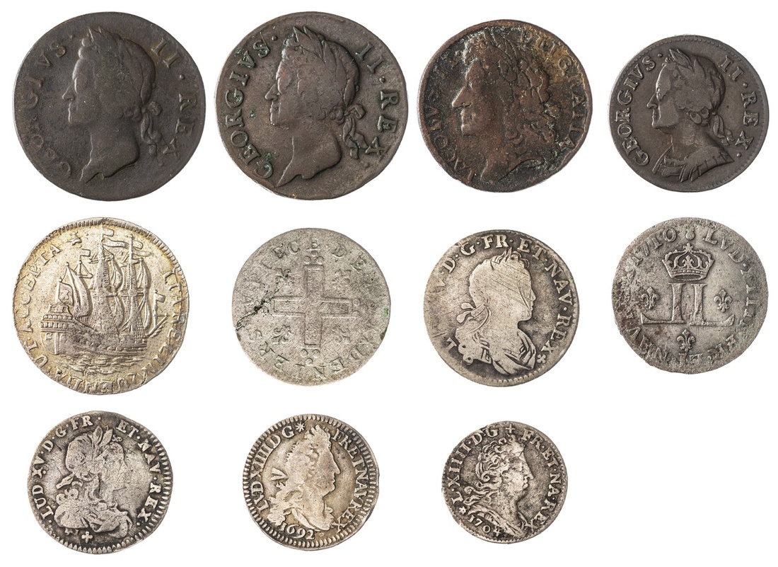 17th-18th Century European Lot. Includes: France. Ecu, 1748 W. A few scratches, 20 Sols de Navarre, 1719 A. Adjustment marks, 4 Sols, 1692 A, 5 Sols, 1704 BB, 10 Sols, 1721 W. Scratches; 30 Deniers, 1710 A (2), Great Britain. Farthing, 1749; Ireland. Gunmoney Shilling, Aug. 1689; Halfpennies, 1747, 1750; and Netherland. Zeeland. 6 Stuivers, 1763. VG-VF. (12)