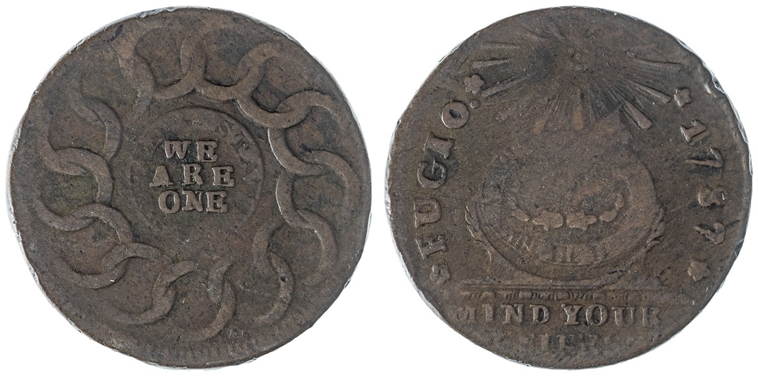 1787 Fugio Cent. Cinquefoil. Very Good. 156 gn. Obverse pinscratches.