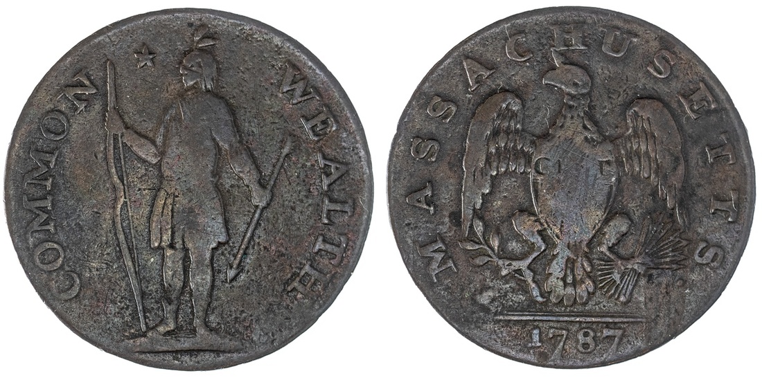 1787 Massachusetts Copper Cent. Arms in left talon, horned eagle. Very Good. 124 gn. Toned over a few old obverse hairline scratches.