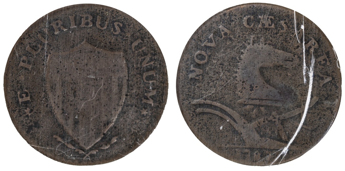 1787 New Jersey Copper. Large Planchet. PCI FN 12. (Crack in plastic encapsulation). Surface corrosion. Brown. Very Good-About Fine.