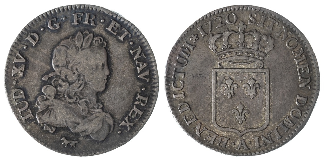 French Colonies. John Law. 1720-A 1/3 Écu de France. Paris mint. Flan neuf. Gad.306, Hod.8. 124 gns. Deep slate gray tone. Very Fine.