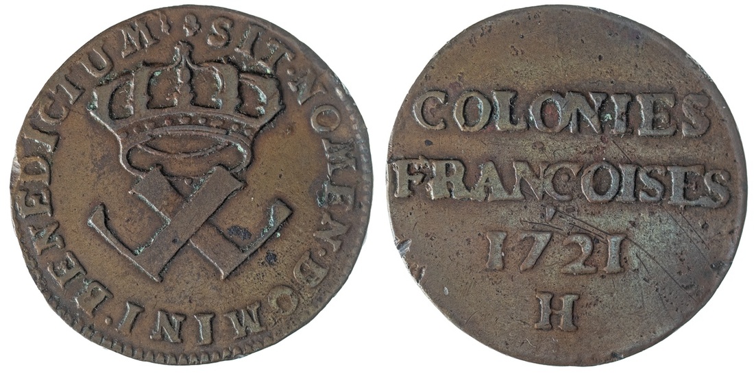 French Colonies. 1721-H 9 Denier. La Rochelle mint. KM 5.2. Some rim tics. Extremely Fine.