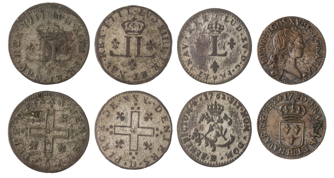 French Colonies. Pair of 1711-D Mousquetaires. Lyon. Vlack 3. Fine and Very Fine; also 1762-B Sou Marque. Rouen. Very Fine; and John Law. 1720-BB Liard au buste enfantin. Strasbourg. Gad.270, Hod.1. 42 gns. (4)
