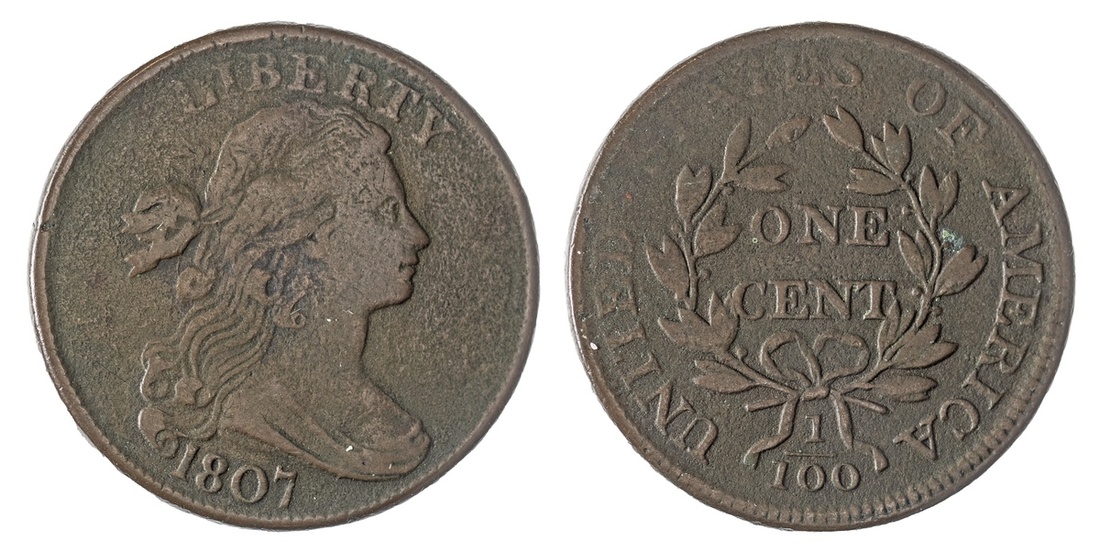 1807 Draped Bust Cent. Large fraction. Fine. Dark brown over surface corrosion.