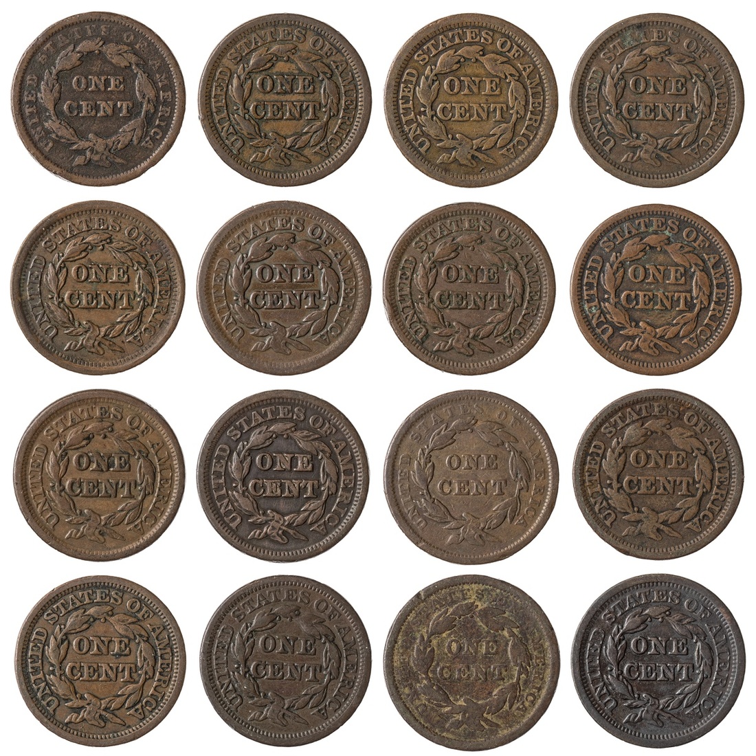 Lot of Braided Hair Large Cents: 1840, 1842 (2), 1845, 1846, 1847, 1848 (4), 1850, 1851, 1852 (3), and 1853. The 1840 Fair-Good, the rest generally Fine-VF. (16).
