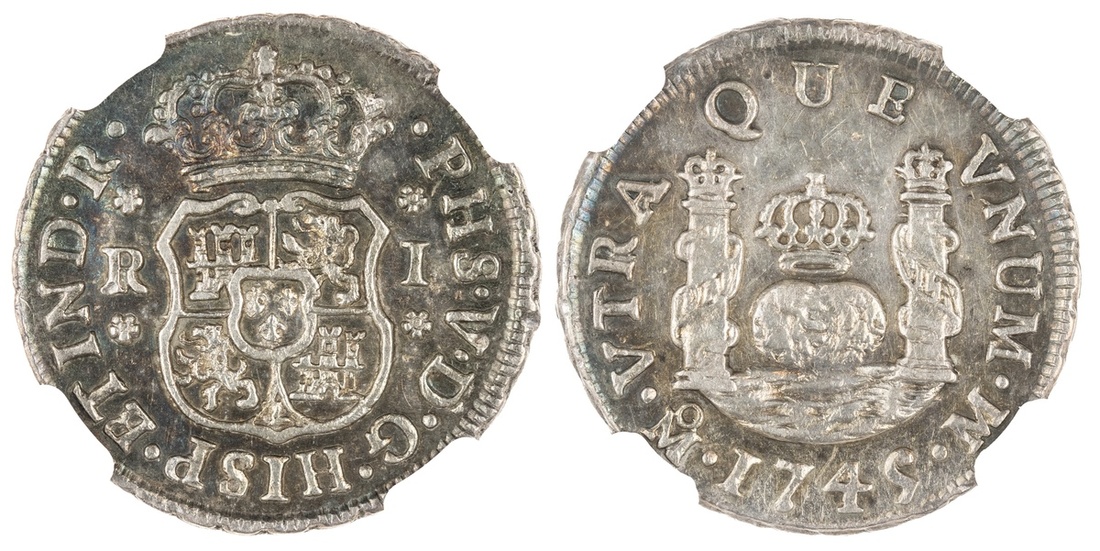 Mexico. Felipe V (1700-1746). Real, 1745 Mo M. Mexico City. Dos Mundos types. KM 75.2. NGC AU 58. Iridescent hues.