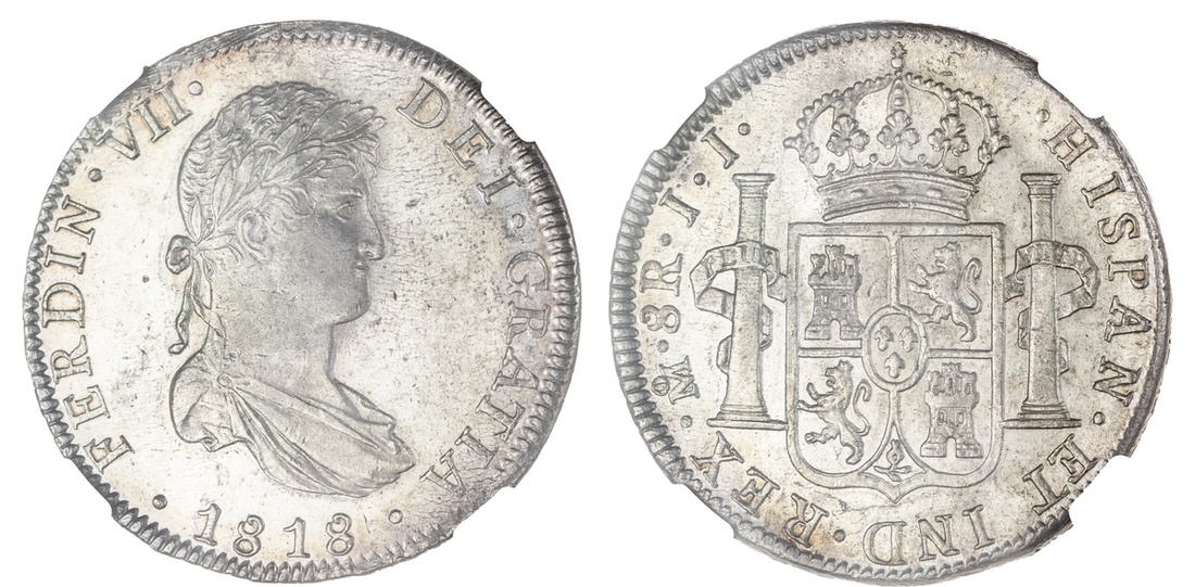 Mexico. Fernando VII (1808-1821). 8 Reales, 1818 Mo JJ. Mexico City. Draped and laureate bust right, rev. Crowned Arms flanked by Pillars. KM 111. NGC MS 62.