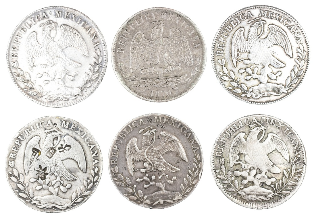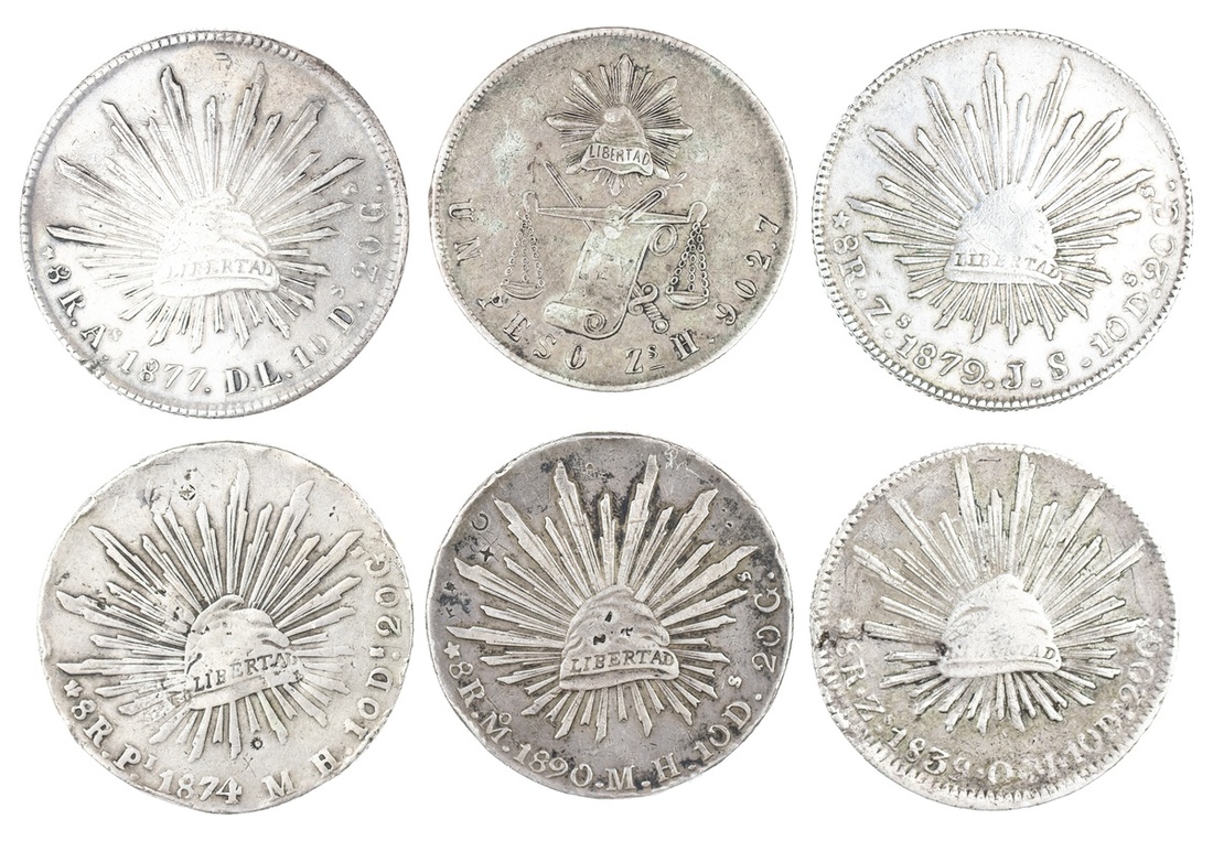 Mexico. Republica. Quintet of Cap 'n Rays 8 Reales: 1877 As DL. Alamos. Two tiny chops. Toned EF; 1890 Mo MH. Mexico City. Various small Chinese and Malay chops. EF; 1874 Pi MH. San Luis Potosi. Some edge bruises, and some large chopmarks, About VF; 1839 Zs OM, 1879 Zs JS. Zacatecas. About VF, diebreak and Good Very Fine with adj. mks on eagle; also Peso, 1870 Zs H. Zacatecas. Toned over light contact marks. EF. (6)