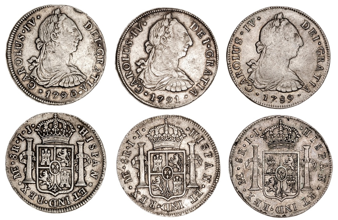 Peru. Carlos IV (1788-1808). 8 Reales, 1789, 1790, and 1791 IJ. Lima. Carlos III bust right; CAROLUS. IV, rev. Crowned Arms flanked by Pillars. KM 87. The first F/VF, the others VF, the second with obverse dig and some scratches. (3)